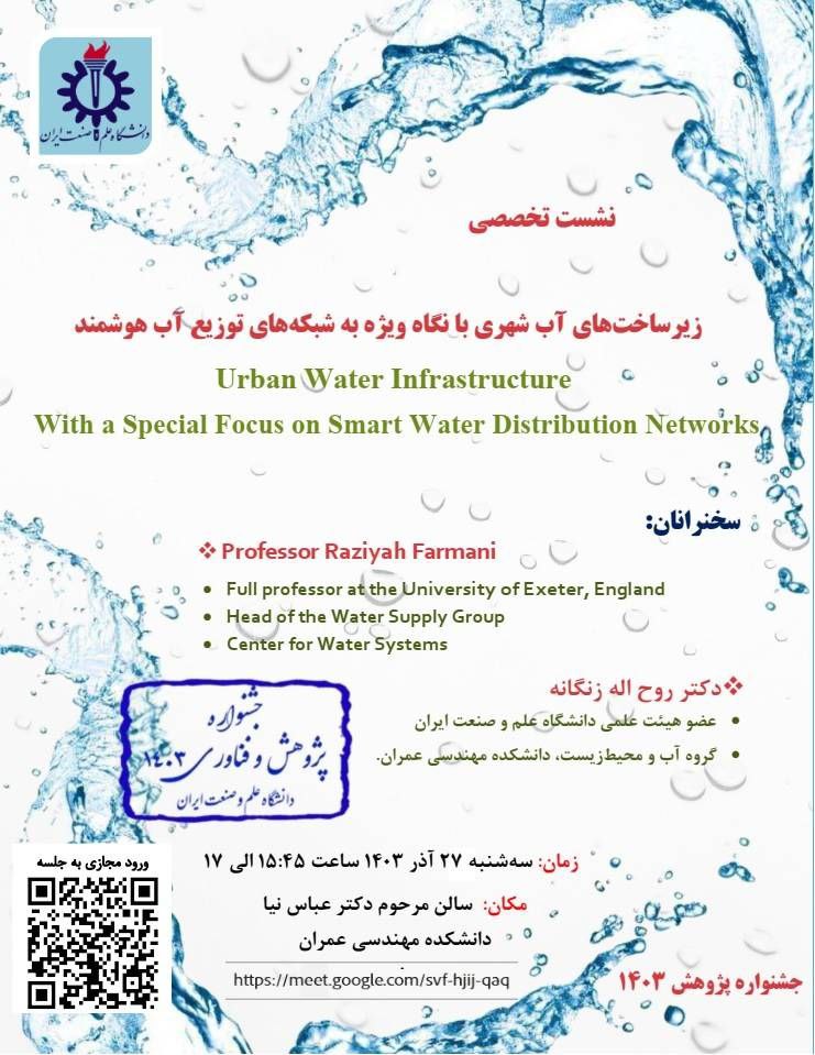 دانشکده مهندسی عمران نشست تخصصی «زیرساختهای آب شهری با نگاه ویژه به شبکه های توزیع آب هوشمند» را برگزار می کند.